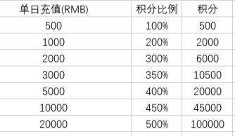 3、积分只可选择现有的7个档位。例如累积充值1200元,可兑换2000积分+当日剩余200元