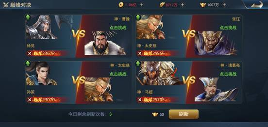 35级开放巅峰对决,每日会自动刷新4名武将对决关卡,若玩家已拥有4名武将中的武将,即可挑战对应关卡。关卡中只可出战该武将1人,战斗胜利后可获得该武将神器碎片及陨铁。